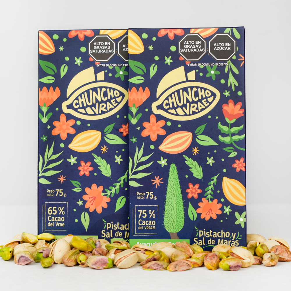 La tableta de chocolate con la combinación de los riquísimos pistachos y la sal de maras con el cacao de aroma más fino al 65%, endulzada con panela, desde el Vraem-Ayacucho.